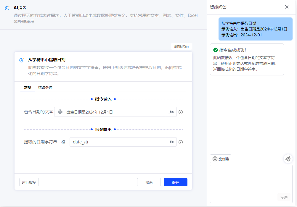 比如我们想要在一段文本中提取日期,则可以在对话右下角的输入框输入需求: 从字符串中提取日期 示例输入:出生日期是2024年12月1日 示例输出:2024-12-01 然后点击发送,该组件会自动根据需求生成Python代码并提取出输入输出,然后可以点击运行指令去测试指令是否符合需求。 提示: 使用自然语言描述需求时,尽量提供示例的输入和输出,以方便让大模型提取成组件的输入和输出
