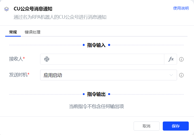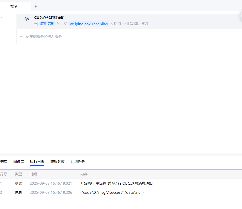 通过名为RPA机器人的CU公众号进行消息通知,消息内容固定。格式为:“执行应用:xxx,应用启动/结束时间:xxxx”