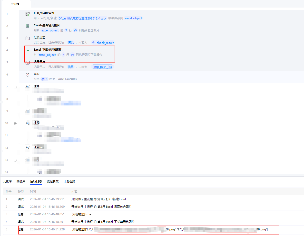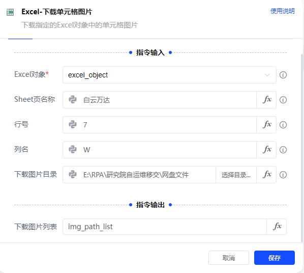 执行【打开/新建Excel】指令打开已有的Excel表格并保存表格对象 --> 使用【Excel-下载单元格图片】指令下载特定单元格内的图片到本地,并输出本地图片路径集合结果。