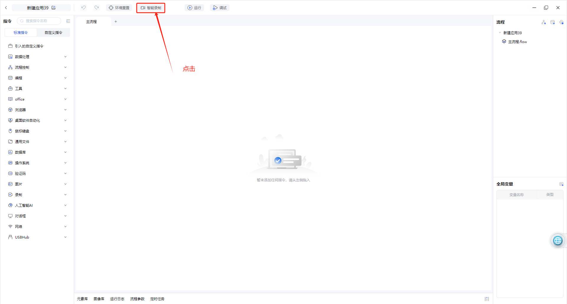 - 打开录制窗口:点击上方工具栏 ⌈ 智能录制 ⌋ 按钮,会将当前设计窗口隐藏并打开录制窗口。