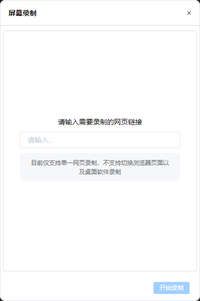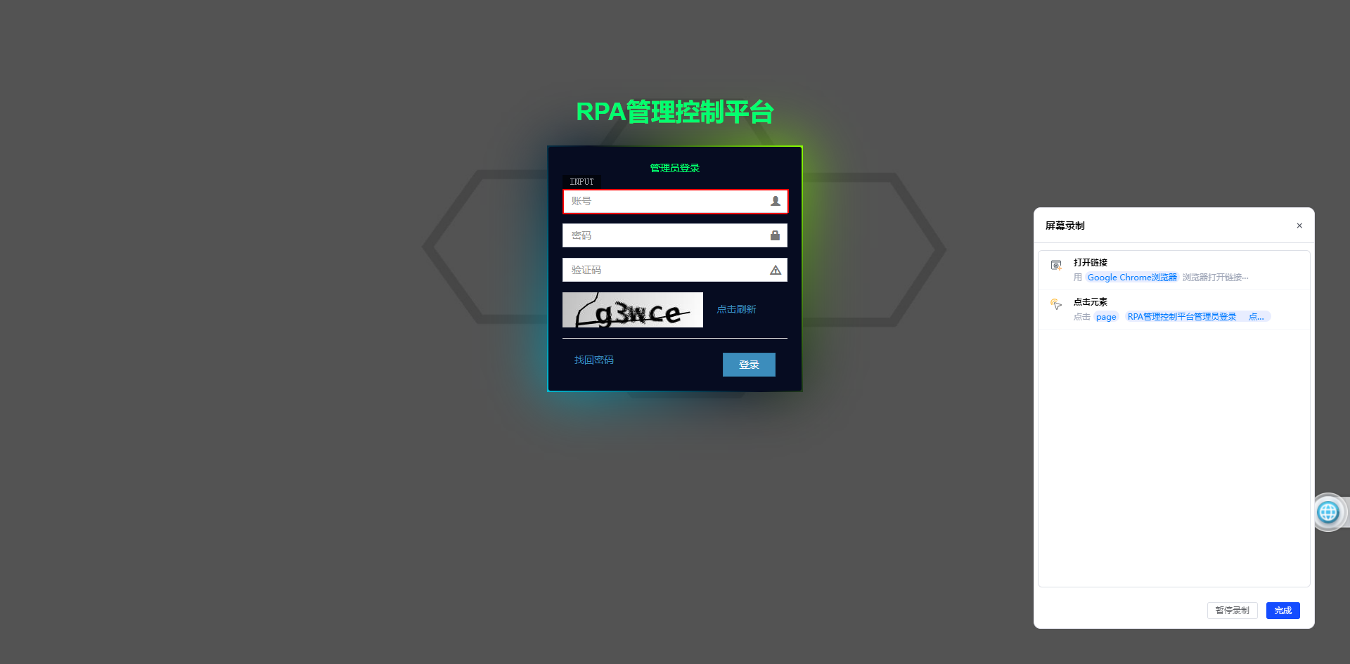 - 开始录制:在屏幕录制窗口中的输入框中输入要录制的网页地址,例如:https://rpaservice.chinaums.com/rpa-console/login.html, 然后点击开始录制,然后会自动打开电脑的chrome浏览器。