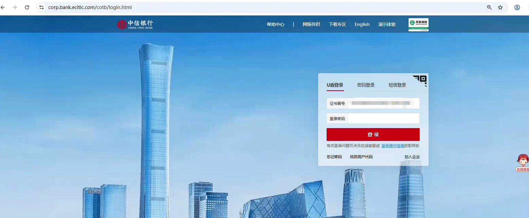 模拟操作员输入密码登录中信银行网银系统。系统地址:https://corp.bank.ecitic.com/cotb/login.html