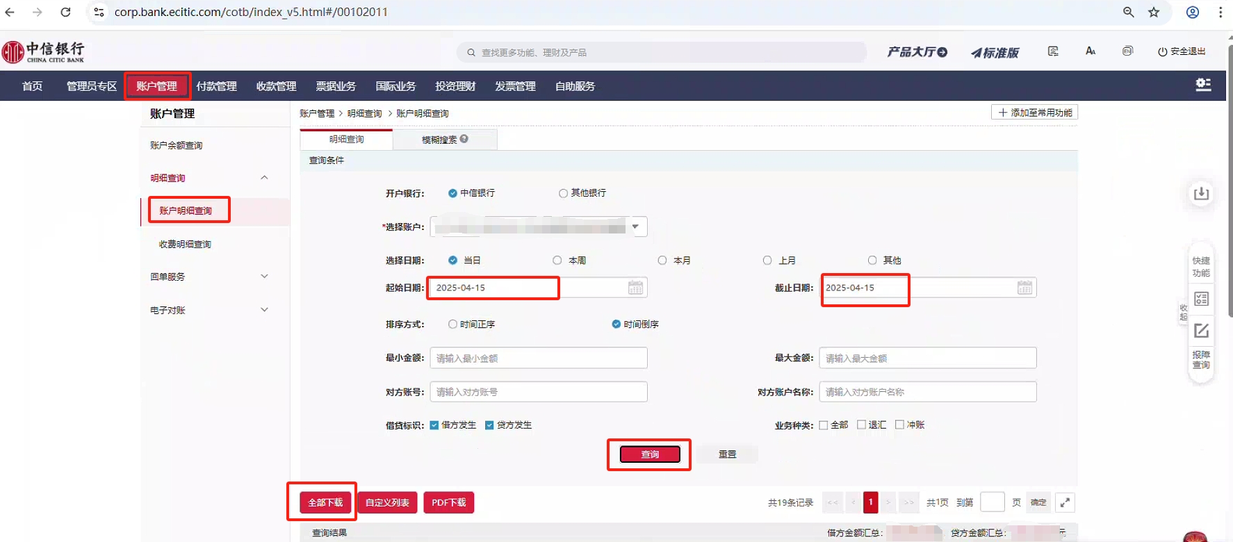 登录成功,依次点击账户管理-账户明细查询,然后输入开始时间和结束时间,点击全部下载将查询出来的明细数据下载下来。